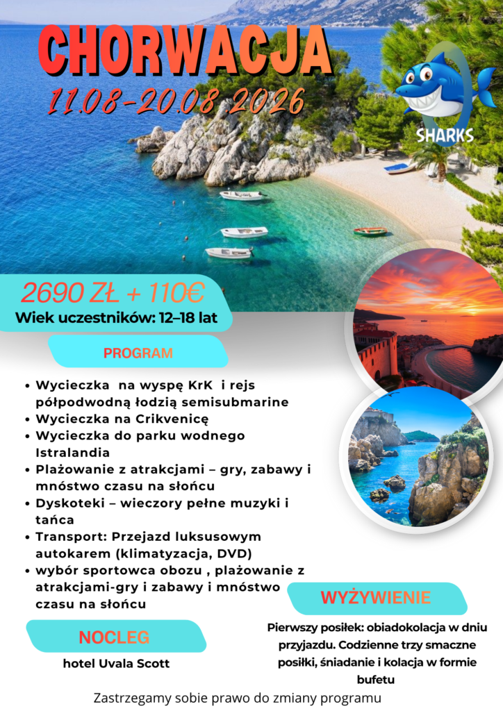 Formularz zgłoszeniowyChorwacja 11.08.2026 – 20.08.2026 Aby wypełnić ten formularz, włącz obsługę JavaScript w przeglądarce.Aby wypełnić ten formularz, włącz obsługę JavaScript w przeglądarce.Dane Osobowe *ImięNazwiskoPESEL *Data Urodzenia *Telefon *Adres e-mail *Prześlij Przypominamy, że gwarancją miejsca na obozie jest wpłata zaliczki w kwocie 400zł na konto podane poniżej. Szkoła Pływania „Sharks” Michał Kułaga Ul. Wyspiańskiego 3/5 32-600 OświęcimNIP: 549-207-61-28 Numer konta: 79105012561000009233639773